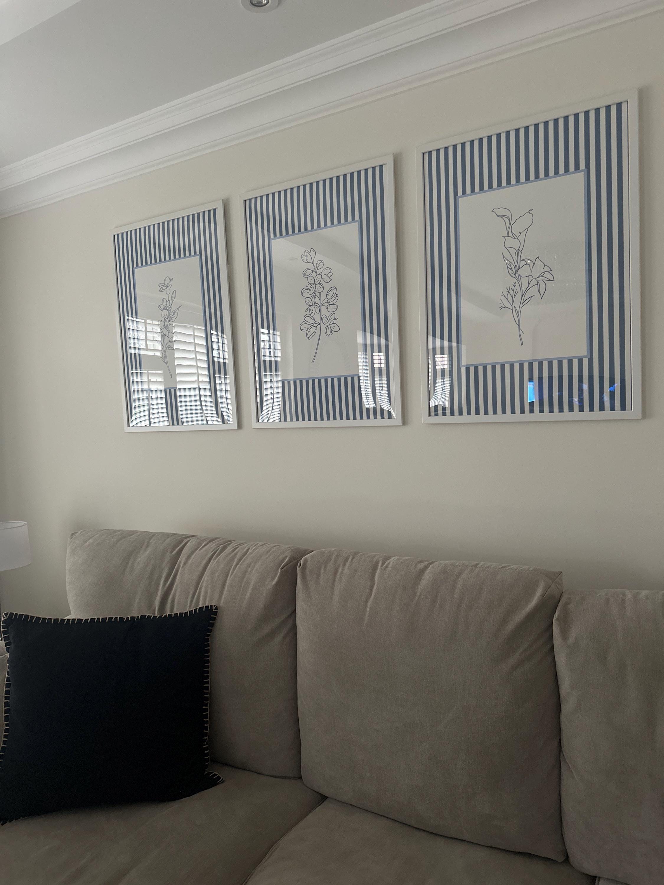 Blue Striped Vintage Style Floral Prints, Set of 3: Cottage Style Flowers Wall Art